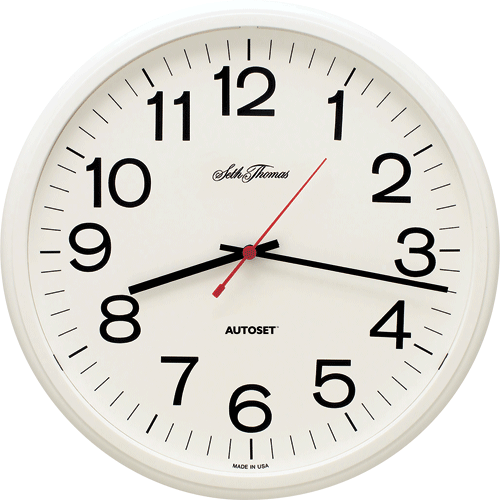 White with Arabic dial. Introducing AUTOSET technology by Seth Thomas. It's taken almost 200 years to make timekeeping this simple. These clocks automatically self-adjust for daylight saving time by "springing ahead" and "falling back" by themselves. AUTOSET technology does not depend on a radio signal, so you can hang these clocks anywhere and they perform perfectly. Free from signal interference. Accurate quartz movement, simple and convenient. AUTOSET by Seth Thomas Runs on two "AA" batteries (not included). 13 1/2" x 13 1/2" x 1 1/4" WIV-1137 |