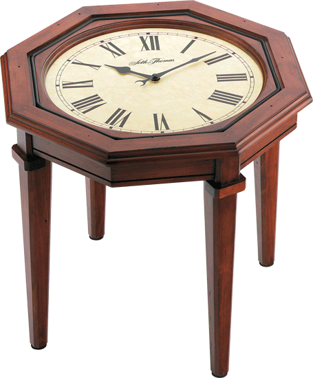 clock beneath beveled glass. Rubber gasket protects from spills. Runs on