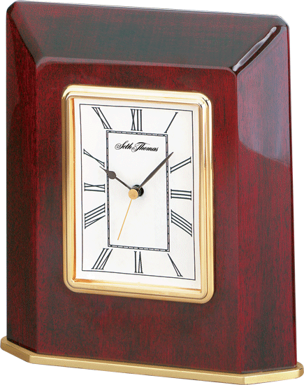 State-of-the-art high-gloss mahogany-finish solid-wood case mounted on a brass base. Rectangular three-step goldtone bezel. Alarm. Engraving plate included. Runs on one AA battery (not included). 7 1/2" x 6 3/4" x 1 7/8" MMH-1416