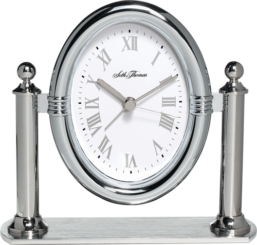 Floating oval dial, supported by chrome posts and matching base. White dial raised silver-tone Roman numerals. Alarm. Runs on one AA battery (not included).