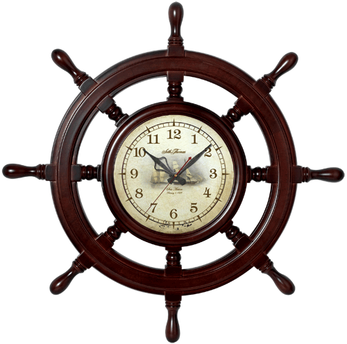 Ships wheel wall clock in walnut finish with Arabic numerals and decorative ship dial.