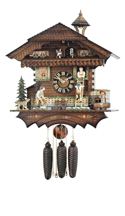 Original, hand carved, eight-day, 3 weight, Black Forest German Cuckoo Clock. This beautifully carved clock features a woman in a window and a man climbing a ladder. The father is chasing the man away with a pitch fork. On the hour the cuckoo bird cuckoos the hour, then the dancers dance in the balcony and the farmer moves towards the man that is climbing the ladder as music is played. No. MD824-19 |